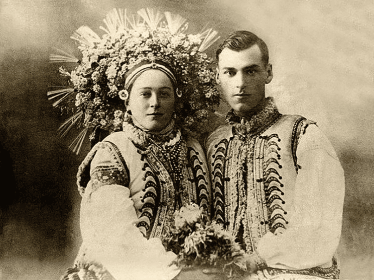 В Черновицком краеведческом музее сохранилось несколько свадебных фото того времени. На одной из фотографий изображены молодожены в современном свадебном наряде. Жених был одет в черном костюме с белой рубашкой, а невеста – в белом платье с большим букетом искусственных цветов в руках. Также мужчина имел тогдашние модные закрученные усы, а в руках держал трость.